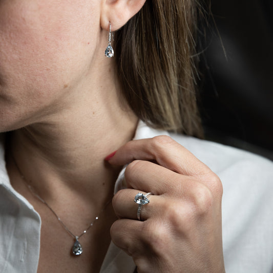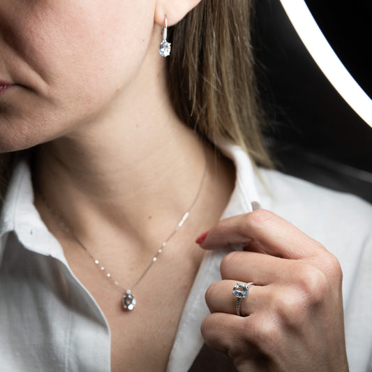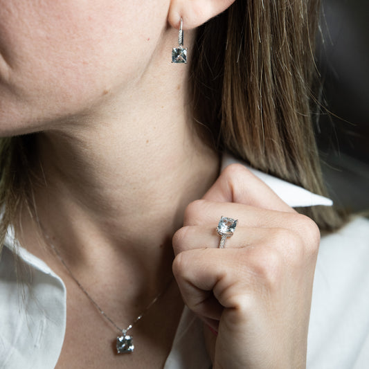 La collezione AcquadiMare comprende collane, orecchini ed anelli con Acquemarine Naturali tagliate nelle forme più ricercate: goccia, ottagonale, ovale, cuore, cushion. In oro bianco 18 kt, impreziosite con diamanti bianchi naturali selezionatissimi, per una combinazione perfetta che la rende sofisticata, raffinata, un capolavoro di eleganza e raffinatezza. Acquemarine e diamanti certificati