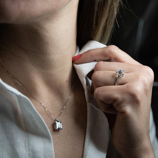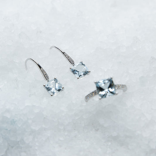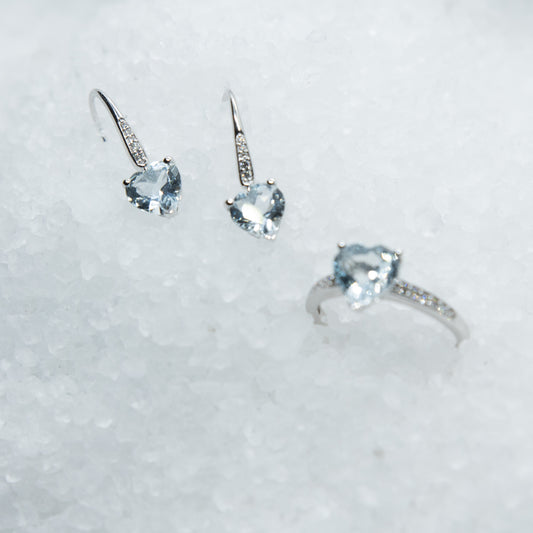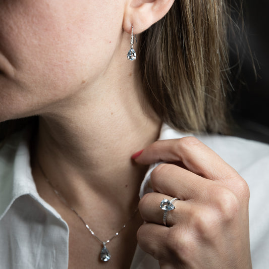 La collezione AcquadiMare comprende collane, orecchini ed anelli con Acquemarine Naturali tagliate nelle forme più ricercate: goccia, ottagonale, ovale, cuore, cushion. In oro bianco 18 kt, impreziosite con diamanti bianchi naturali selezionatissimi, per una combinazione perfetta che la rende sofisticata, raffinata, un capolavoro di eleganza e raffinatezza. Acquemarine e diamanti certificati